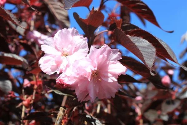 Japansk kirsebær med rødt løv, blomsterne er fyldte og lyserøde og står godt til de mørkerøde blade.